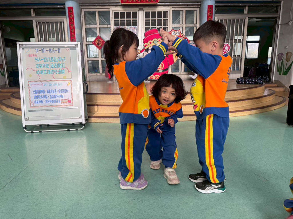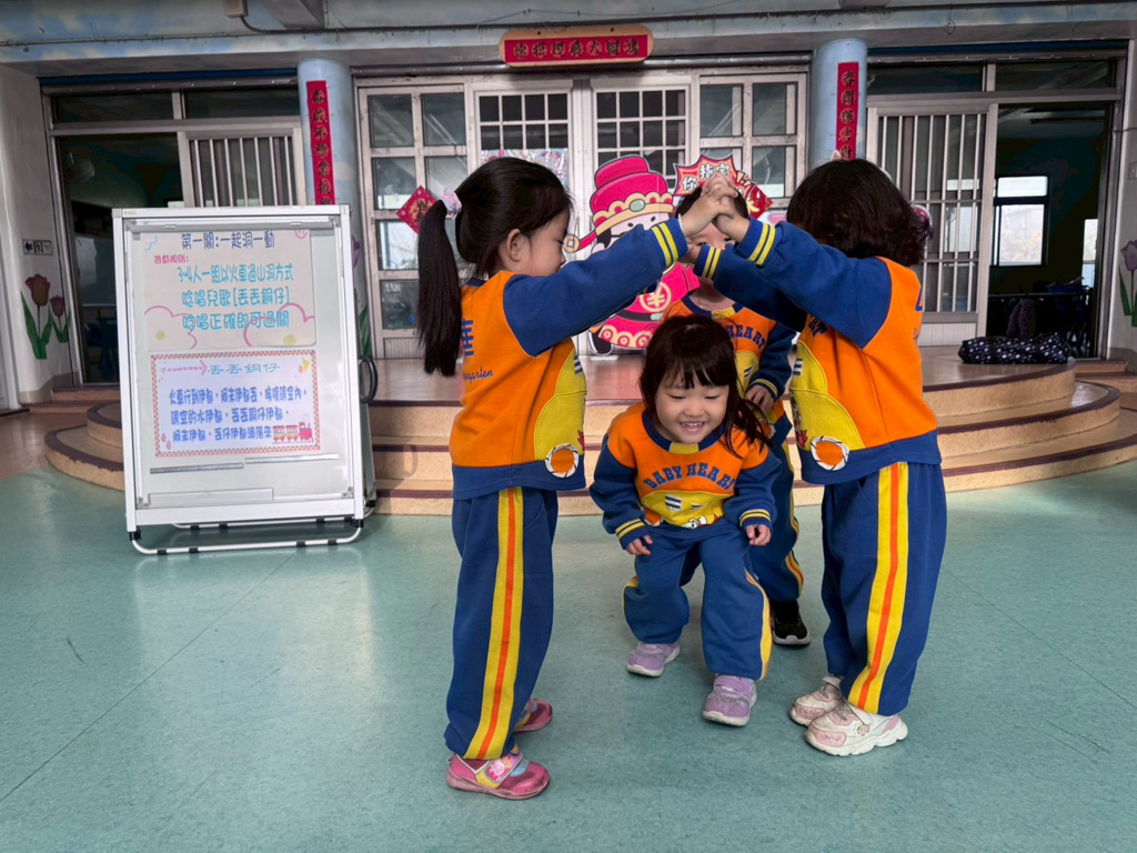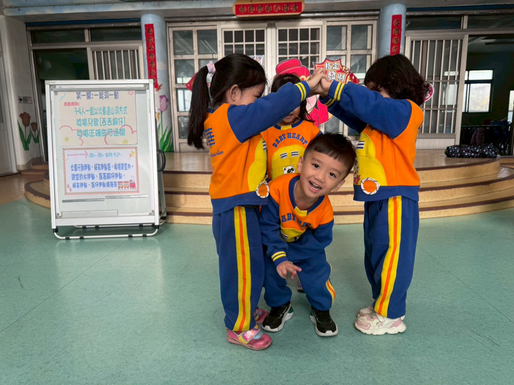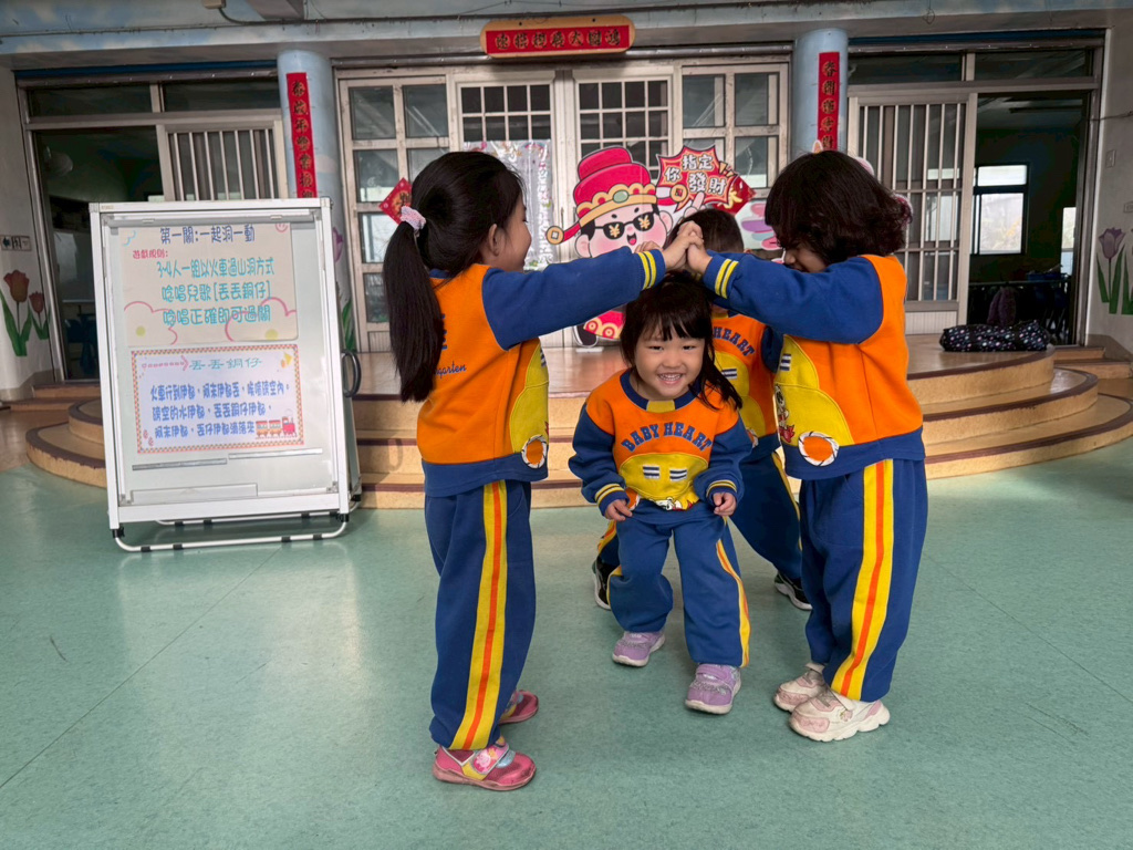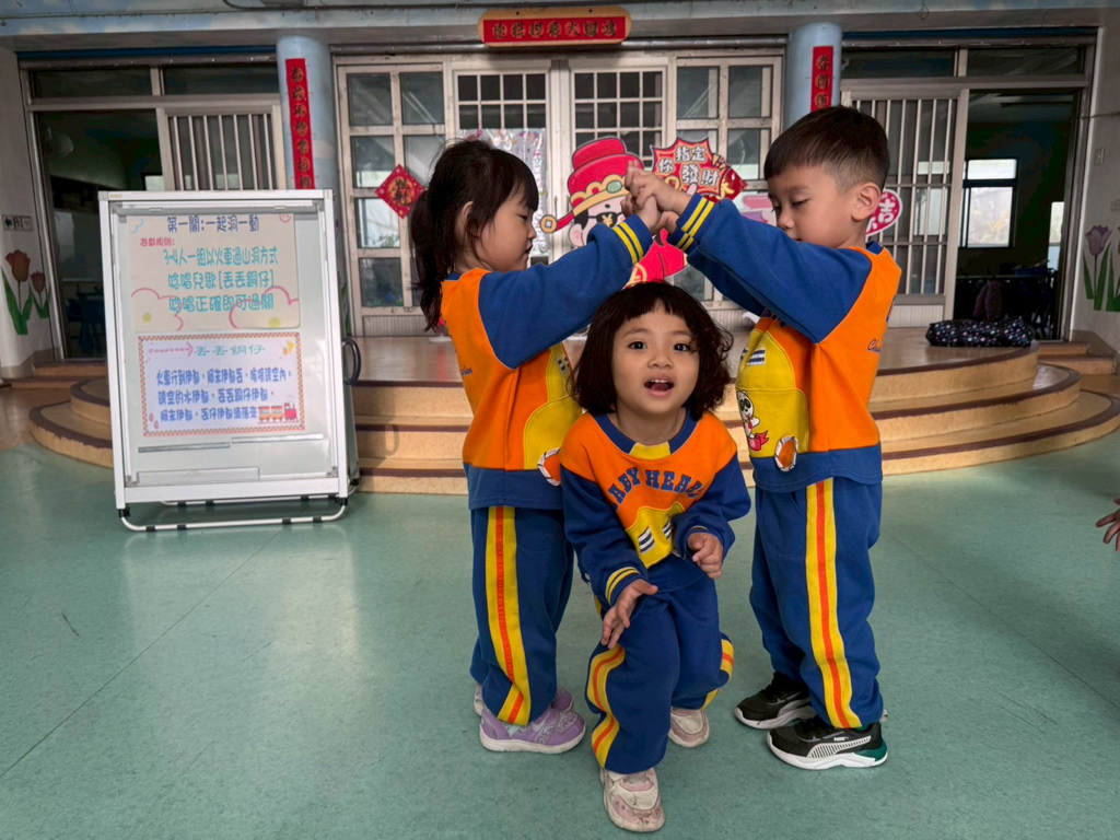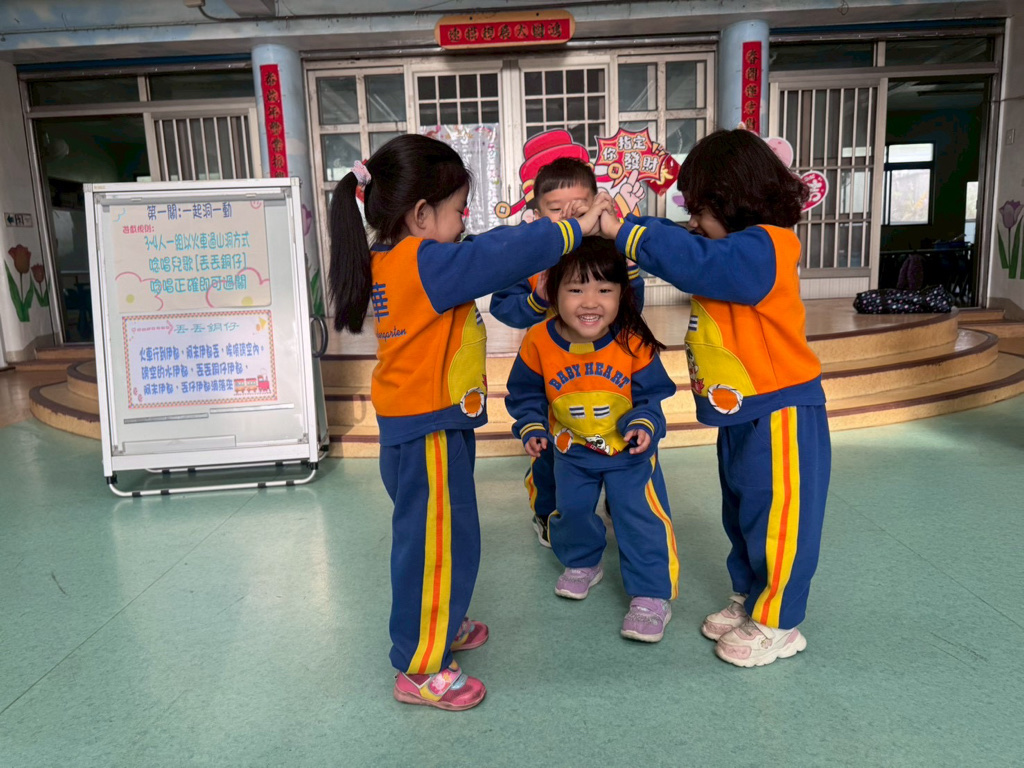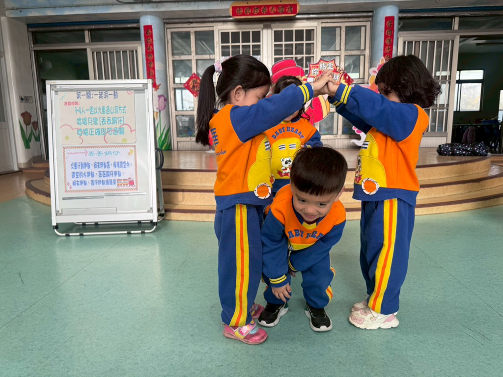 第一關~一起洞一動,4人一組以火車過山洞方式進行,一邊唸唱兒歌「丟丟銅仔」!