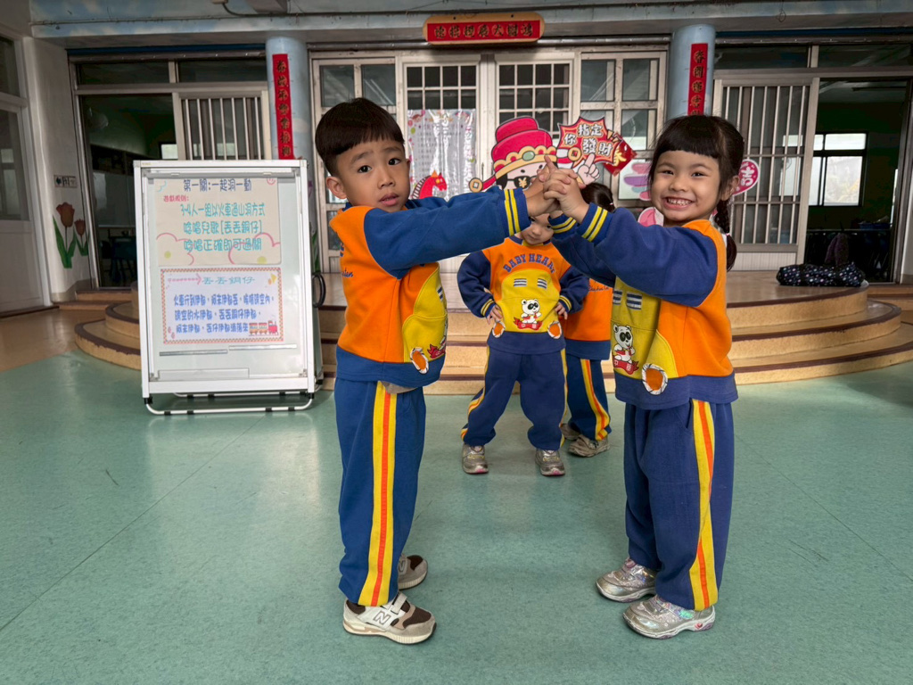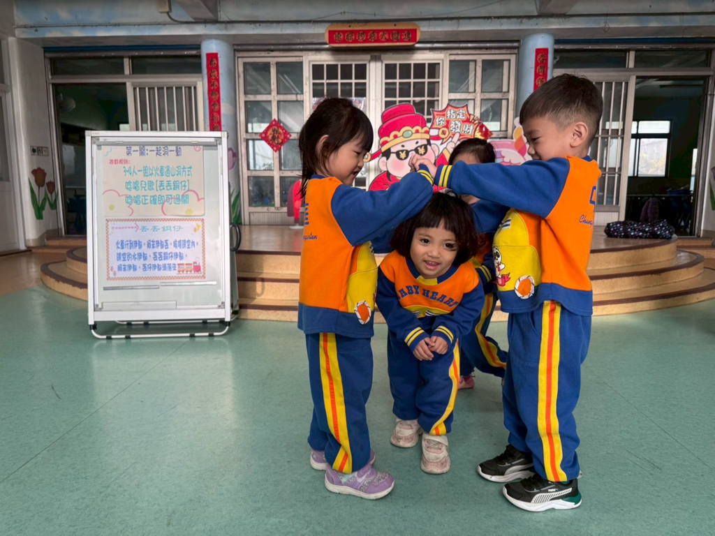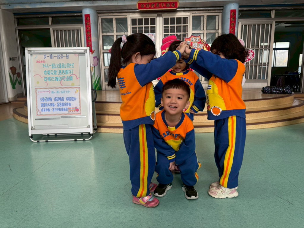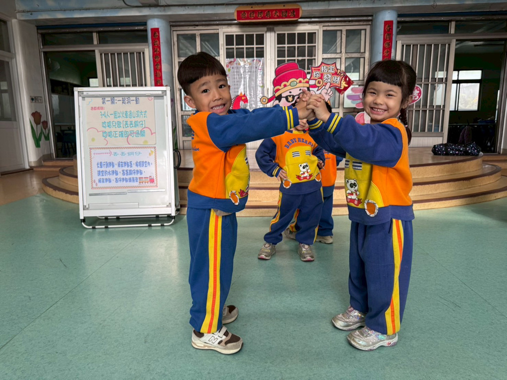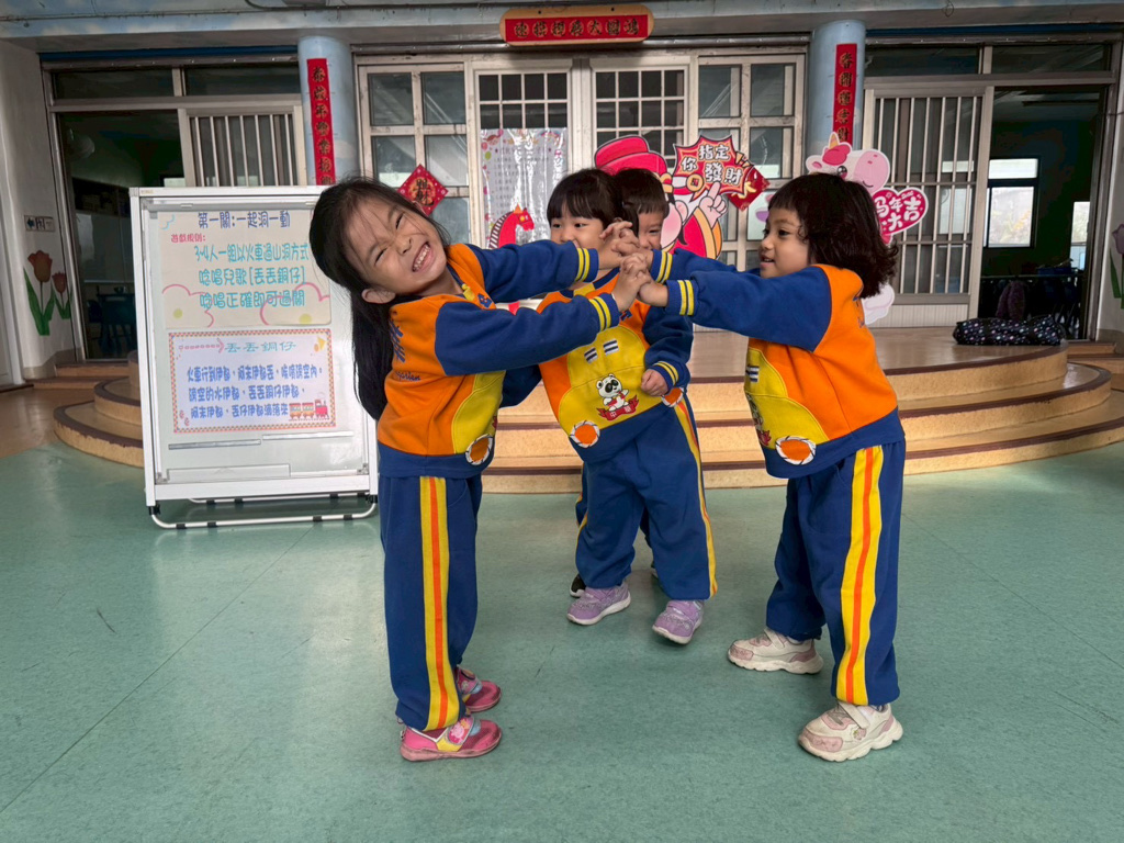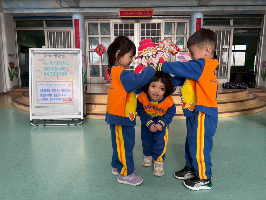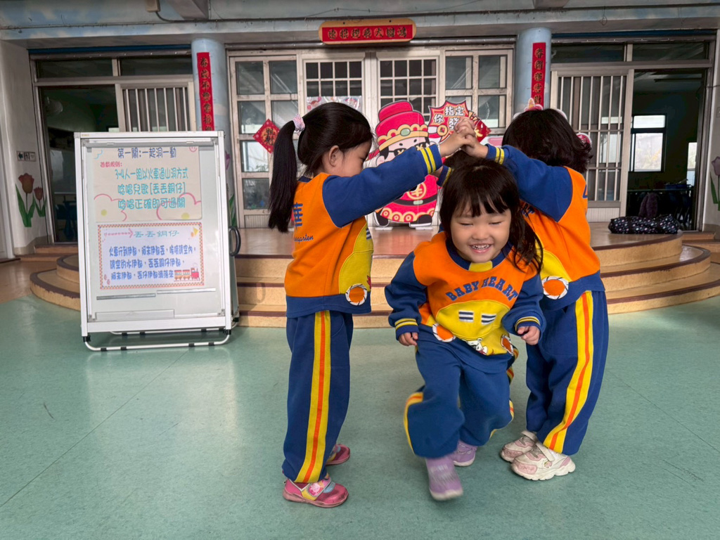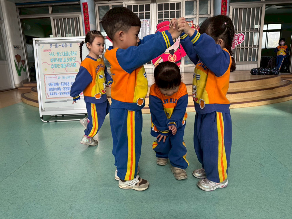 第一關~一起洞一動,4人一組以火車過山洞方式進行,一邊唸唱兒歌「丟丟銅仔」!