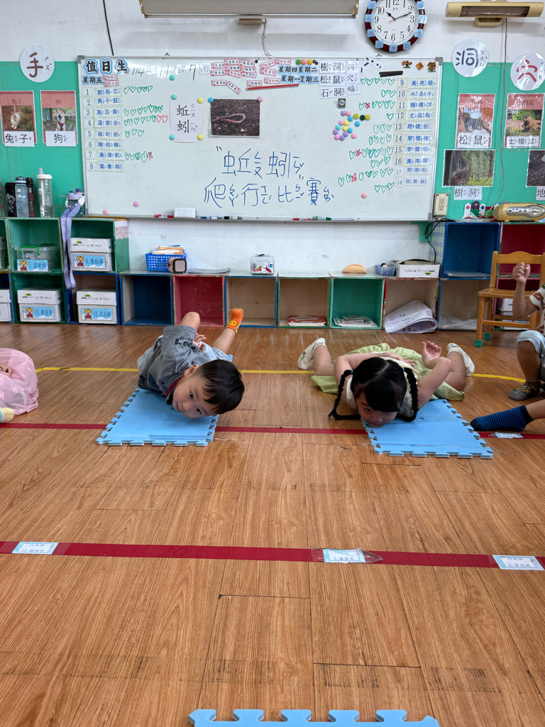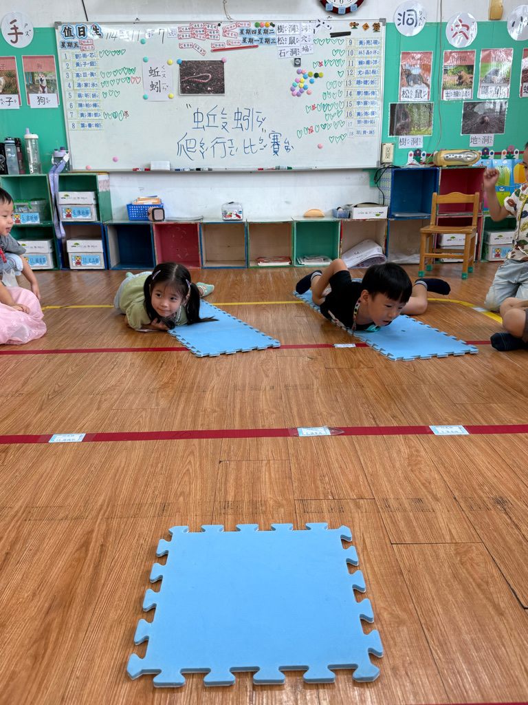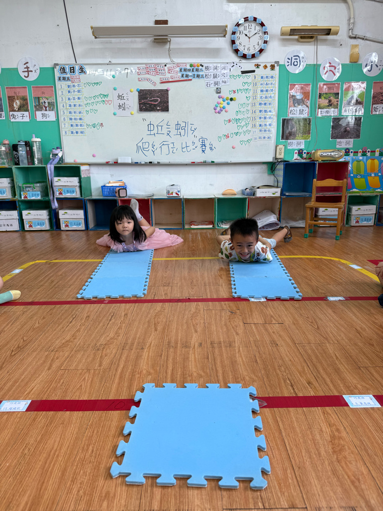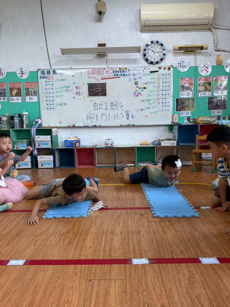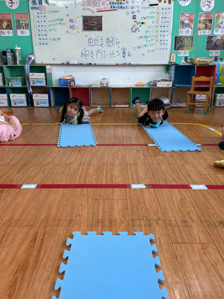 小蚯蚓沒手沒腳怎麼走路呢 一起用學蚯蚓用身體爬行 大家一起比賽