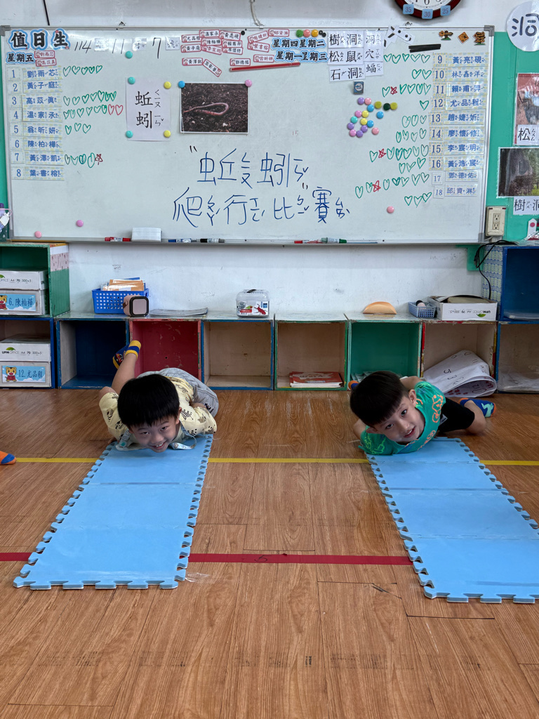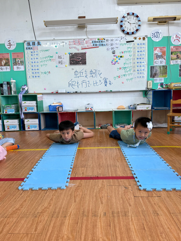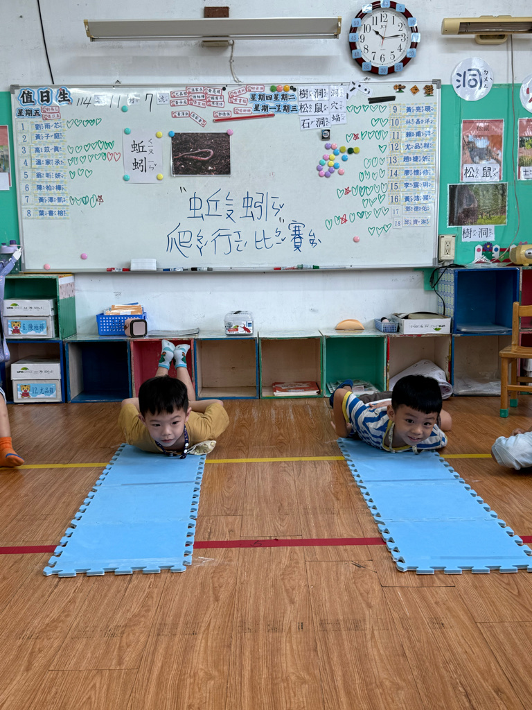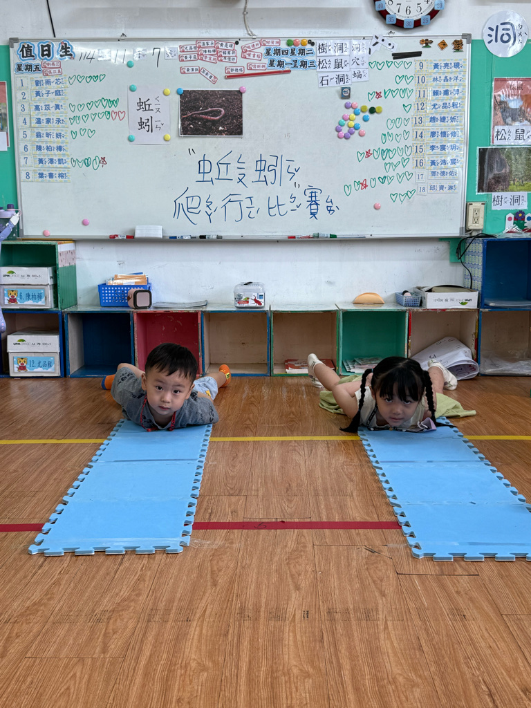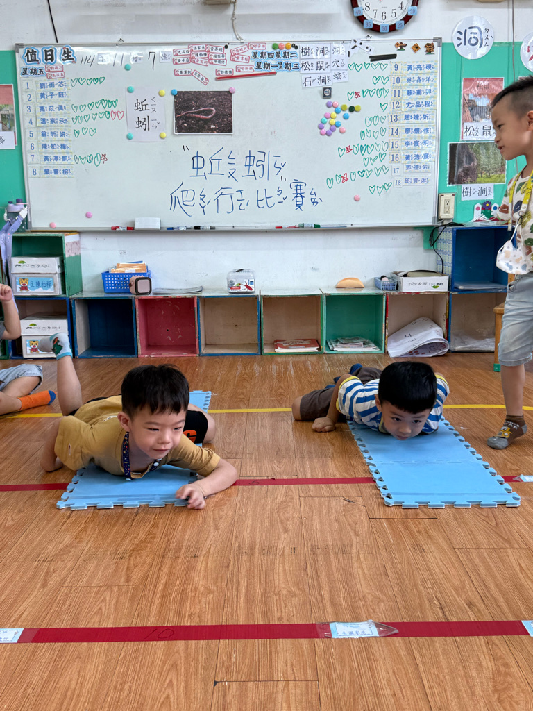 小蚯蚓沒手沒腳怎麼走路呢 一起用學蚯蚓用身體爬行 大家一起比賽