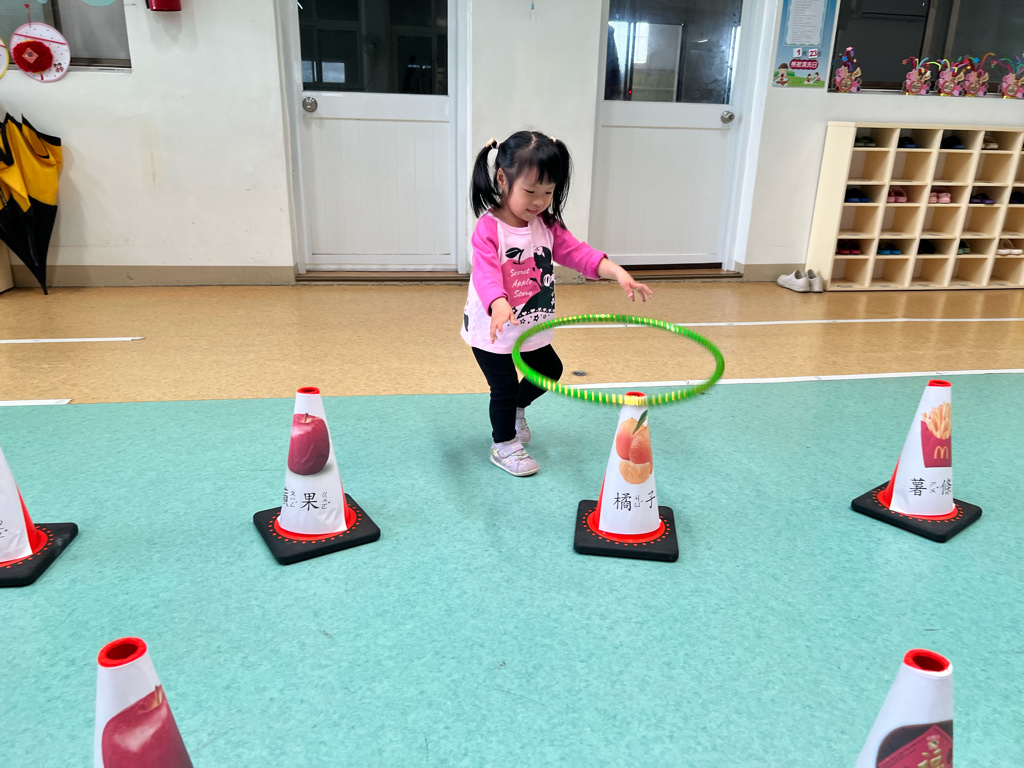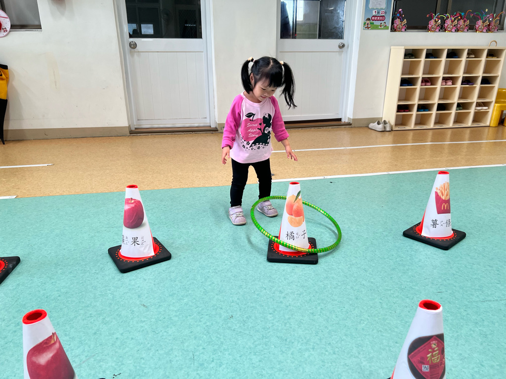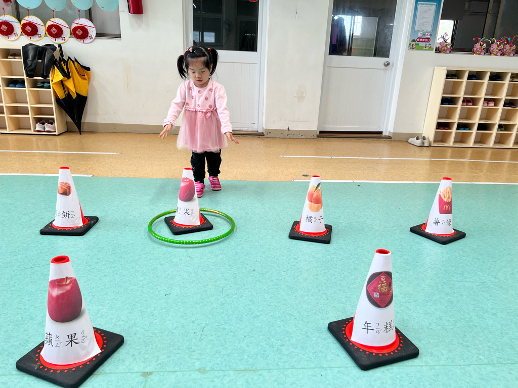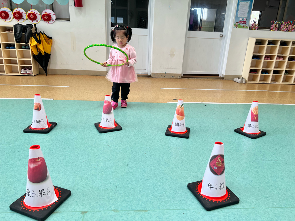 第二關-《關注好運氣》~將呼啦圈丟出並套住貼有吉祥物品寓意的三角錐,即可過關。