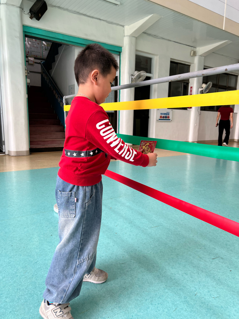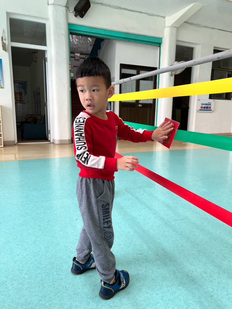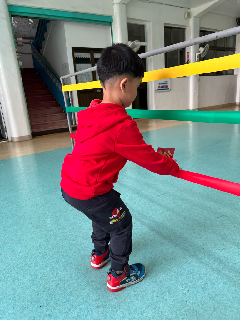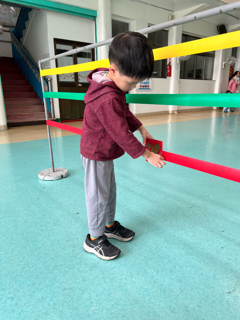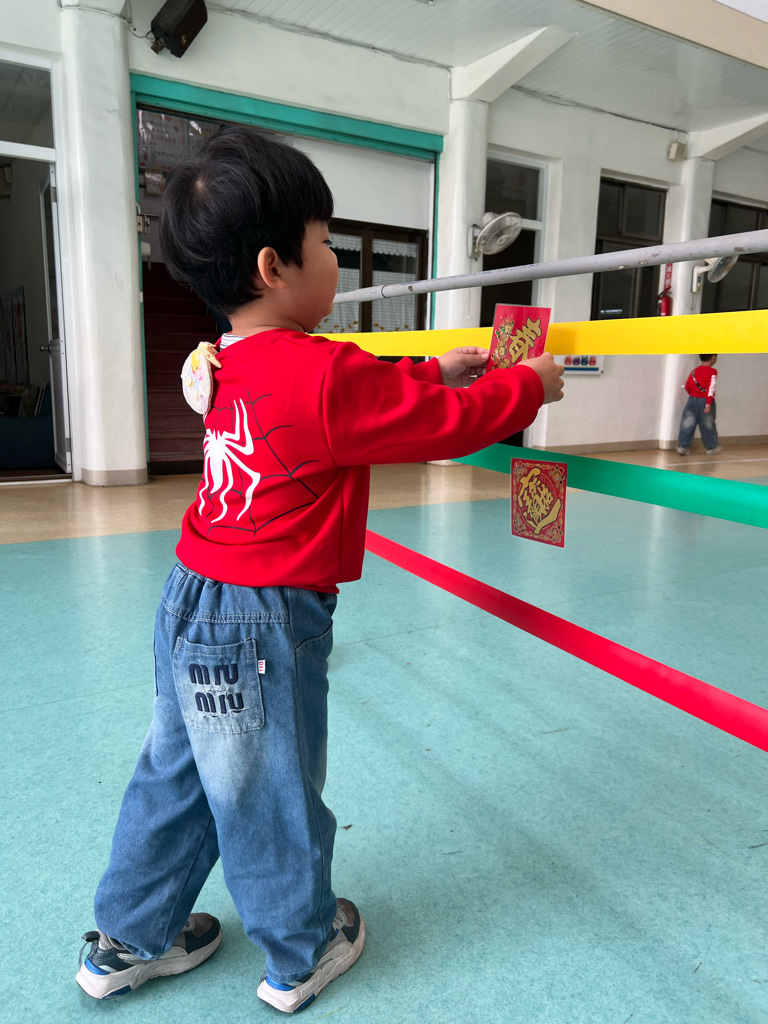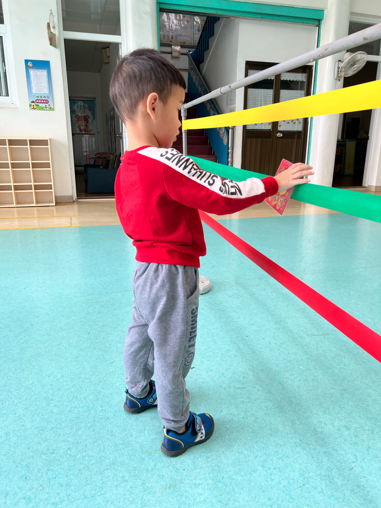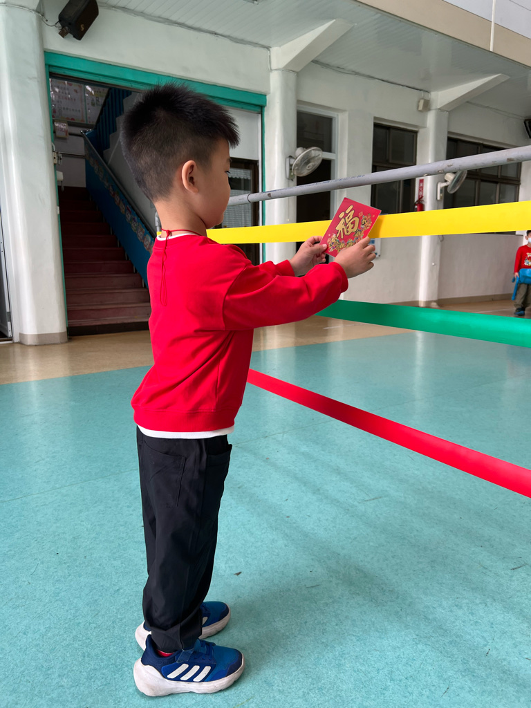 第一關-《幼幼福氣牆》~拿取一個福字並將福字貼在膠帶牆上,即可過關。
