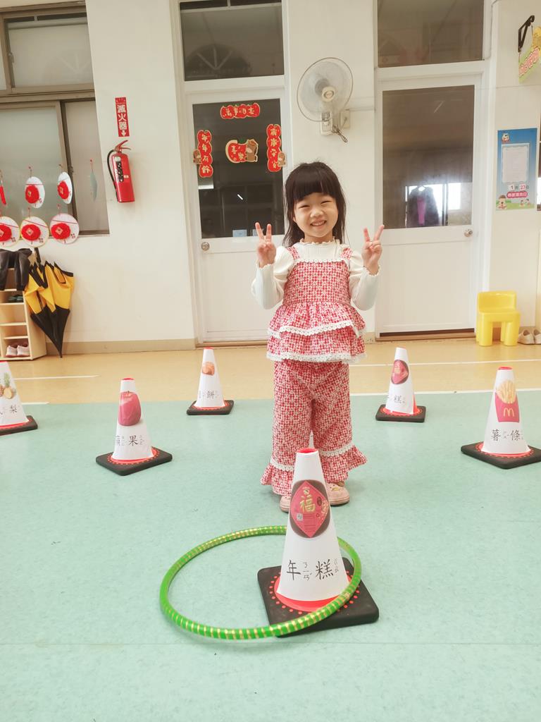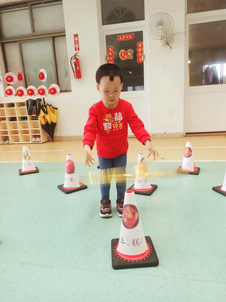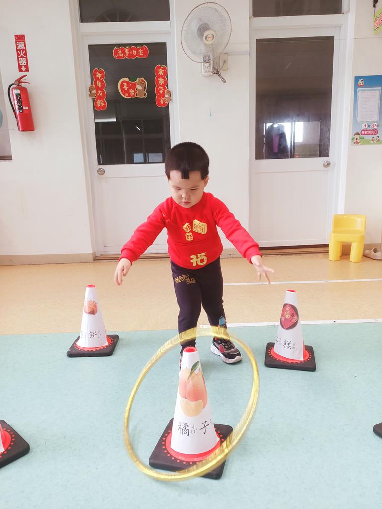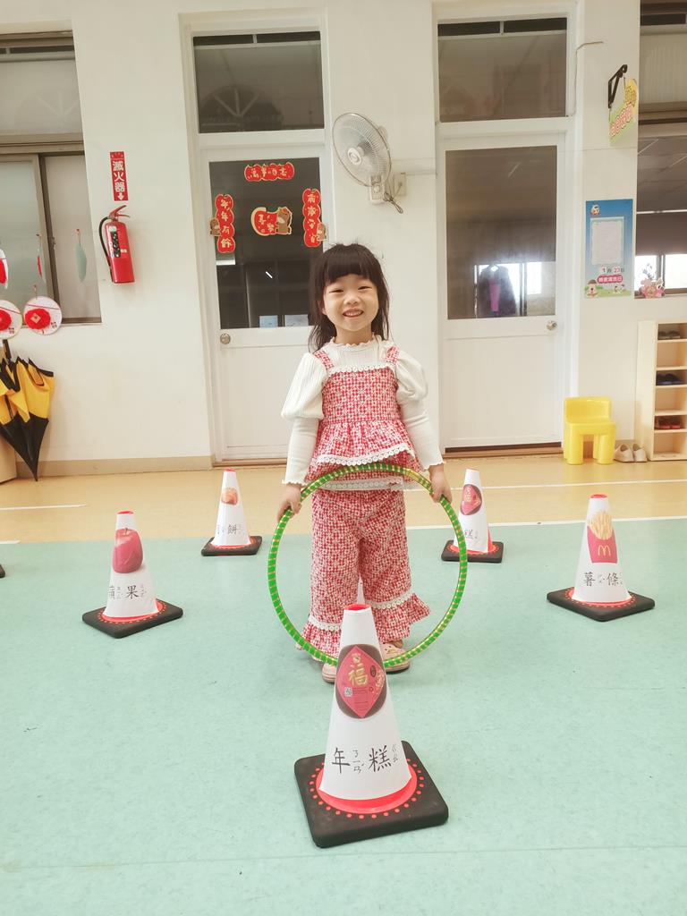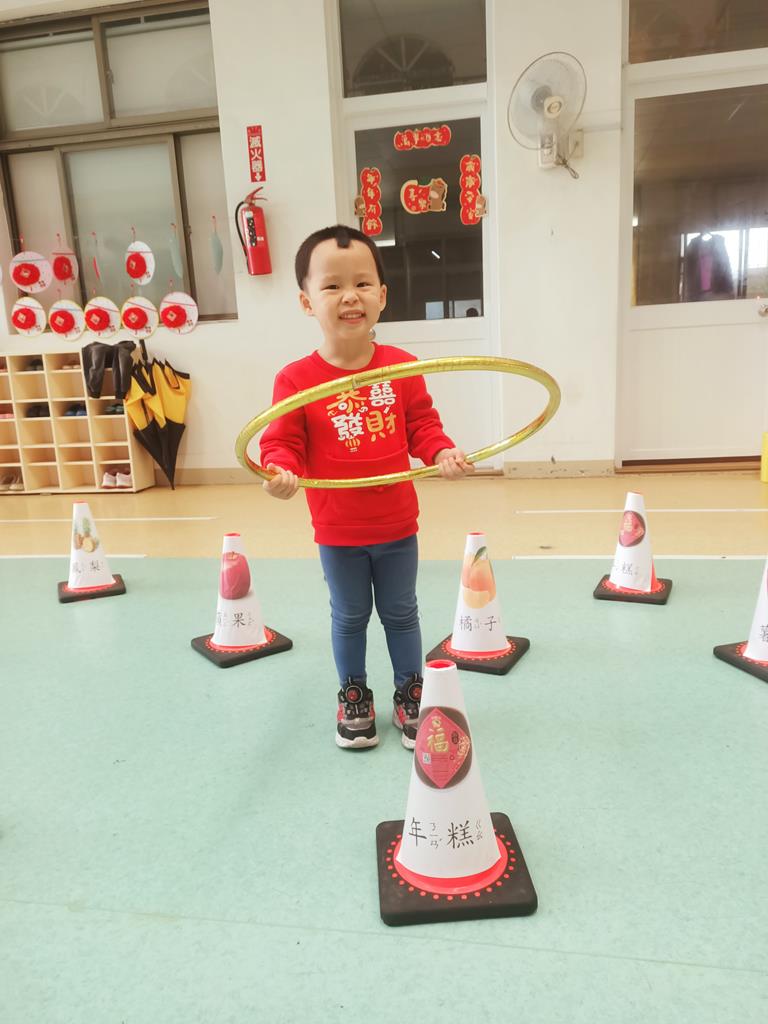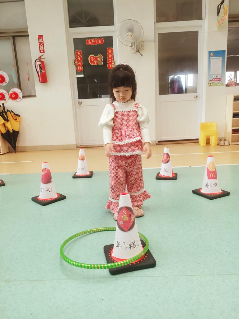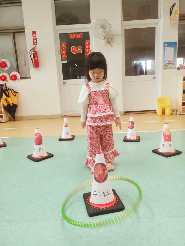 第二關《圈住好運氣》:用呼拉圈套在有貼有吉祥物品寓意的三角錐,即可過關