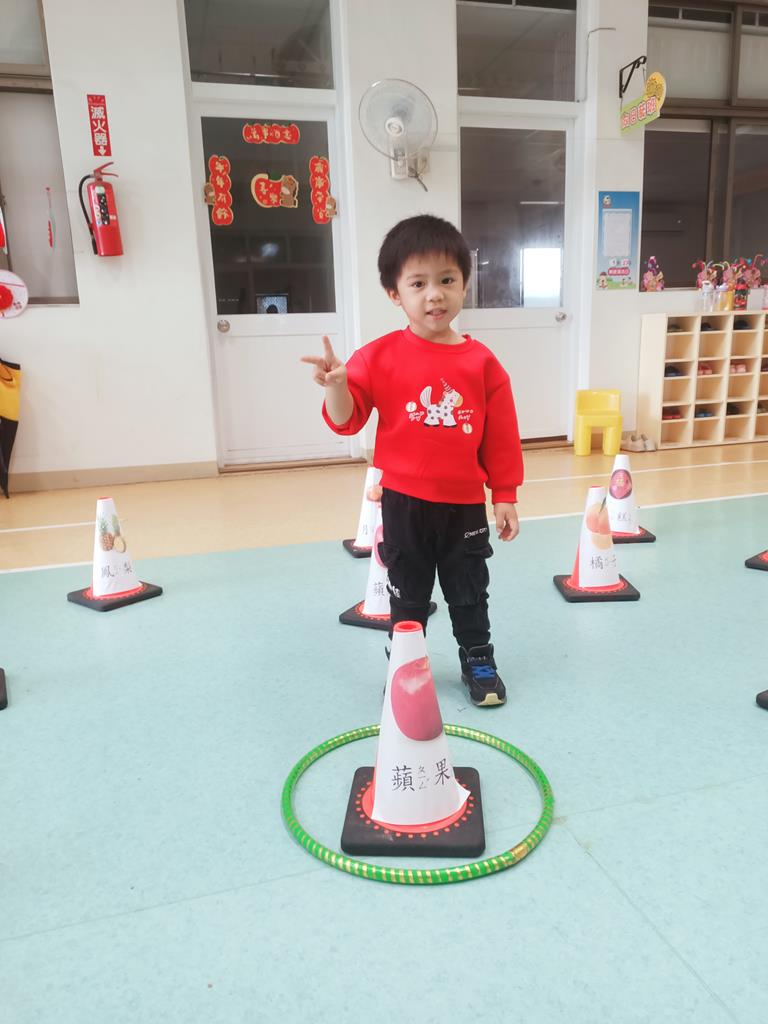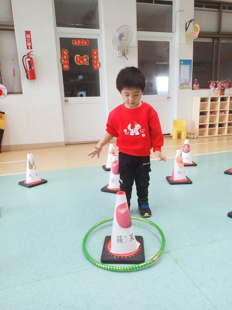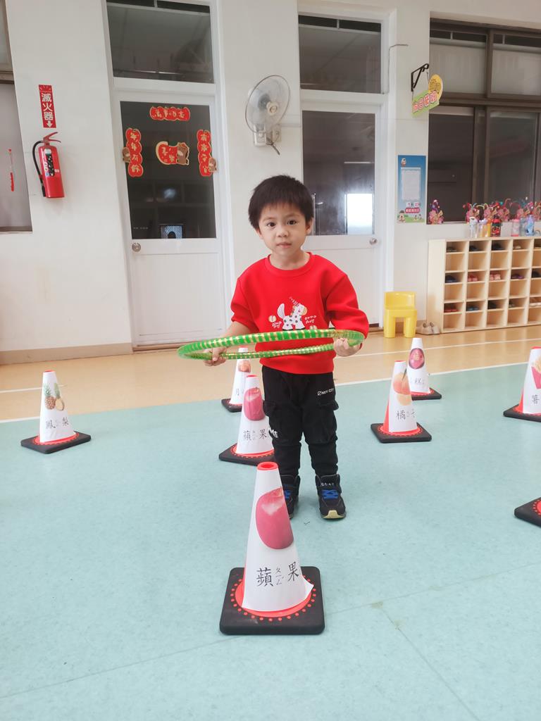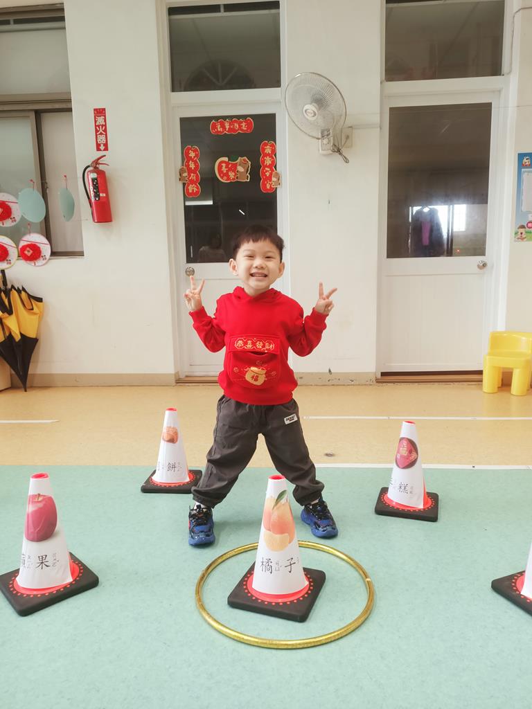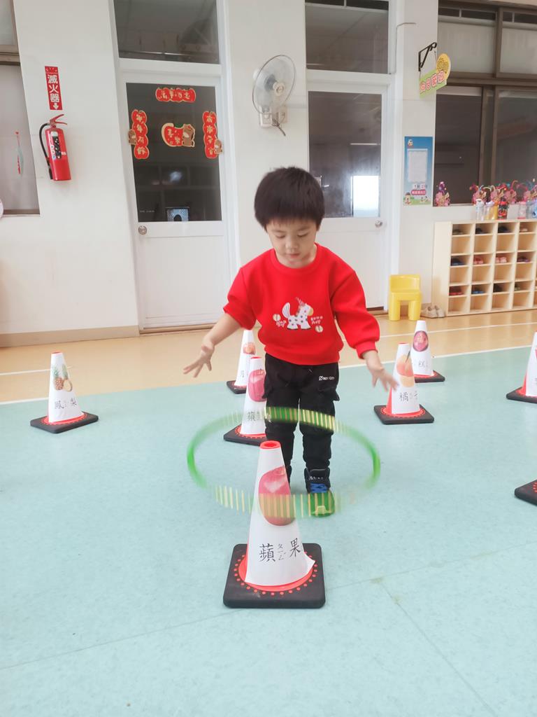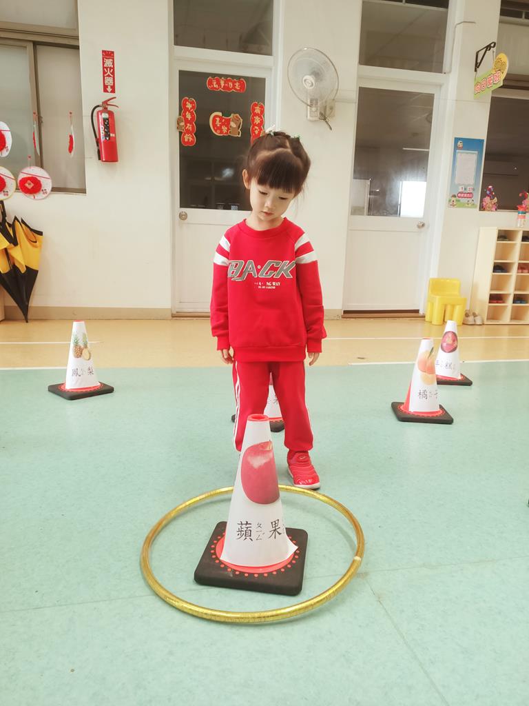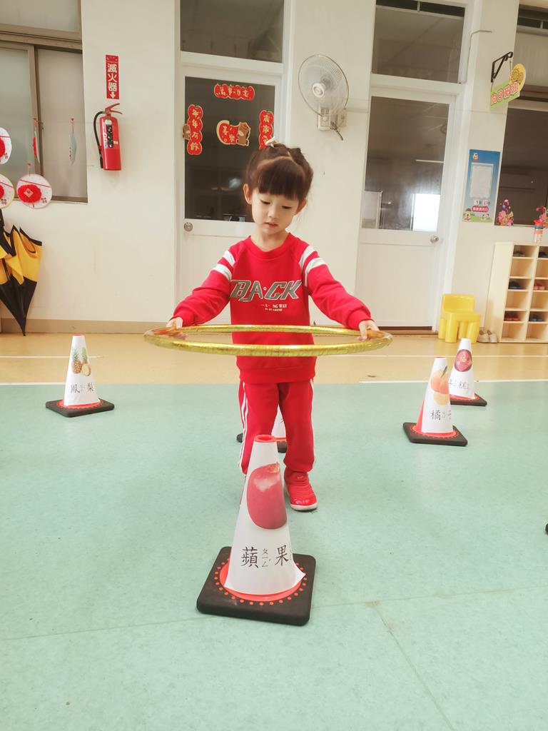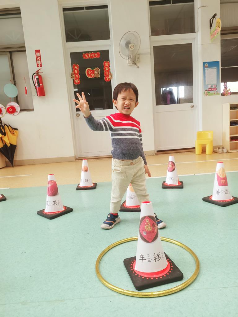 第二關《圈住好運氣》:用呼拉圈套在有貼有吉祥物品寓意的三角錐,即可過關