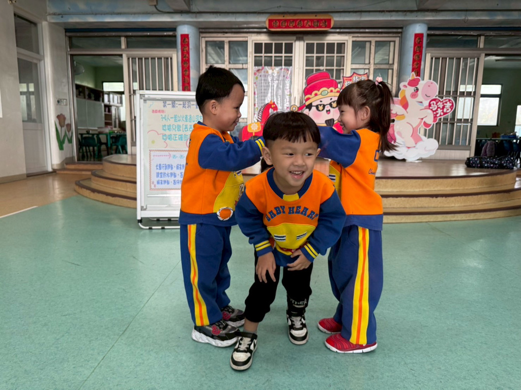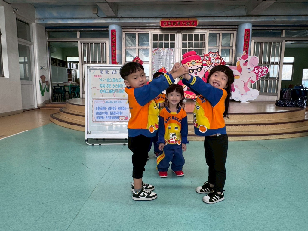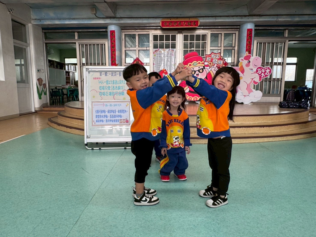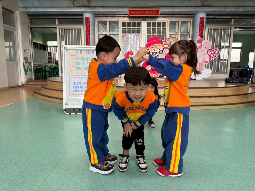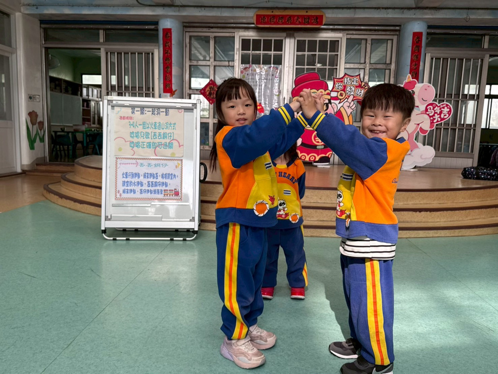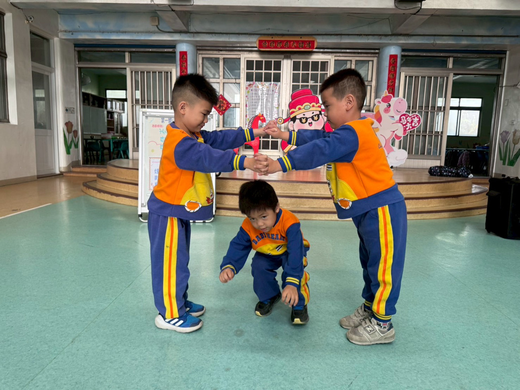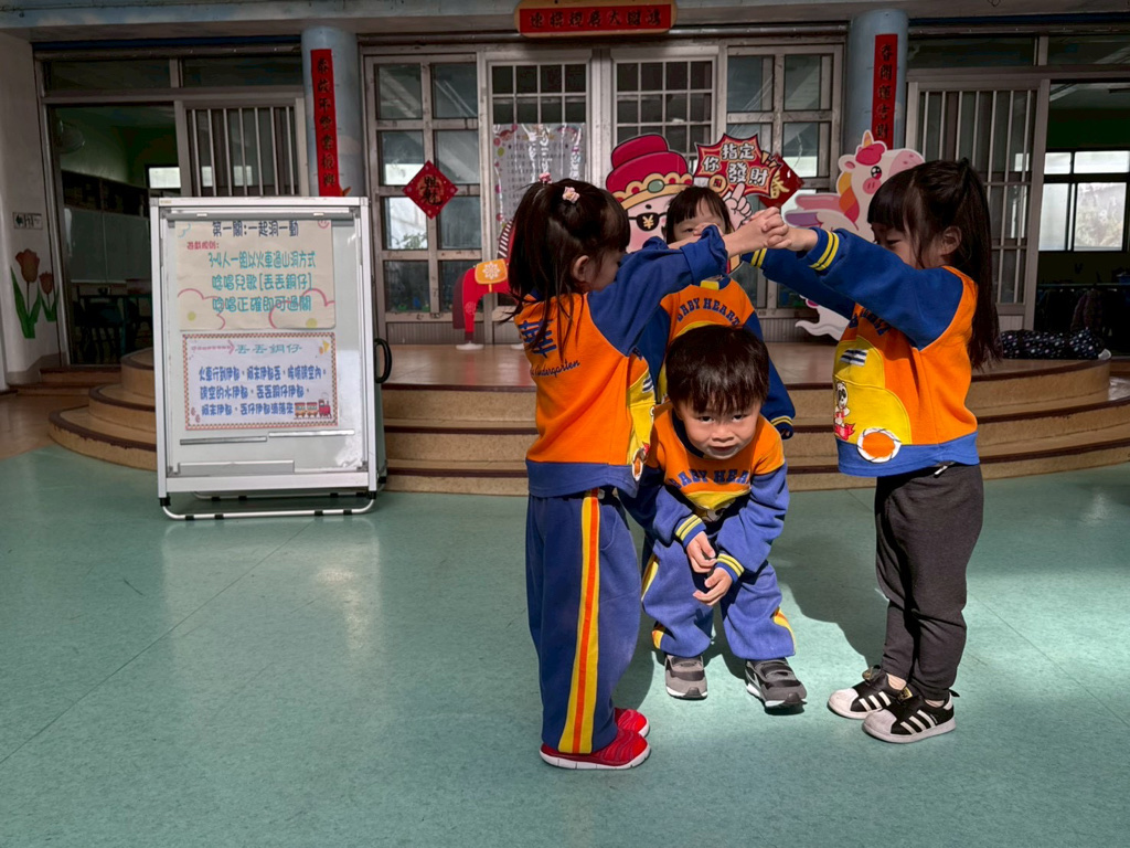 第一關~一起洞一動,4人一組以火車過山洞方式進行,一邊唸唱兒歌「丟丟銅仔」!