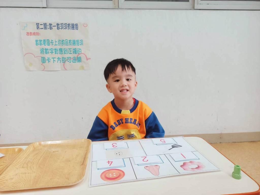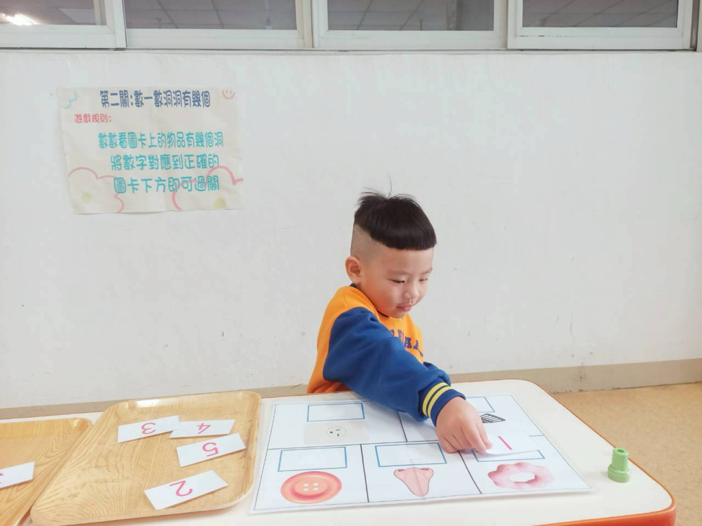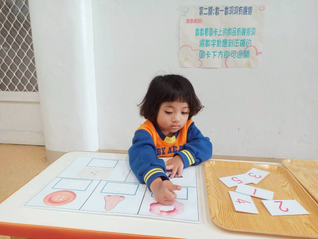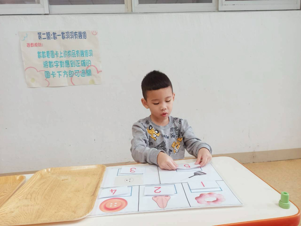 第二關~數一數有幾個洞,先數數圖片上物品洞的數量再將對應數字貼上!