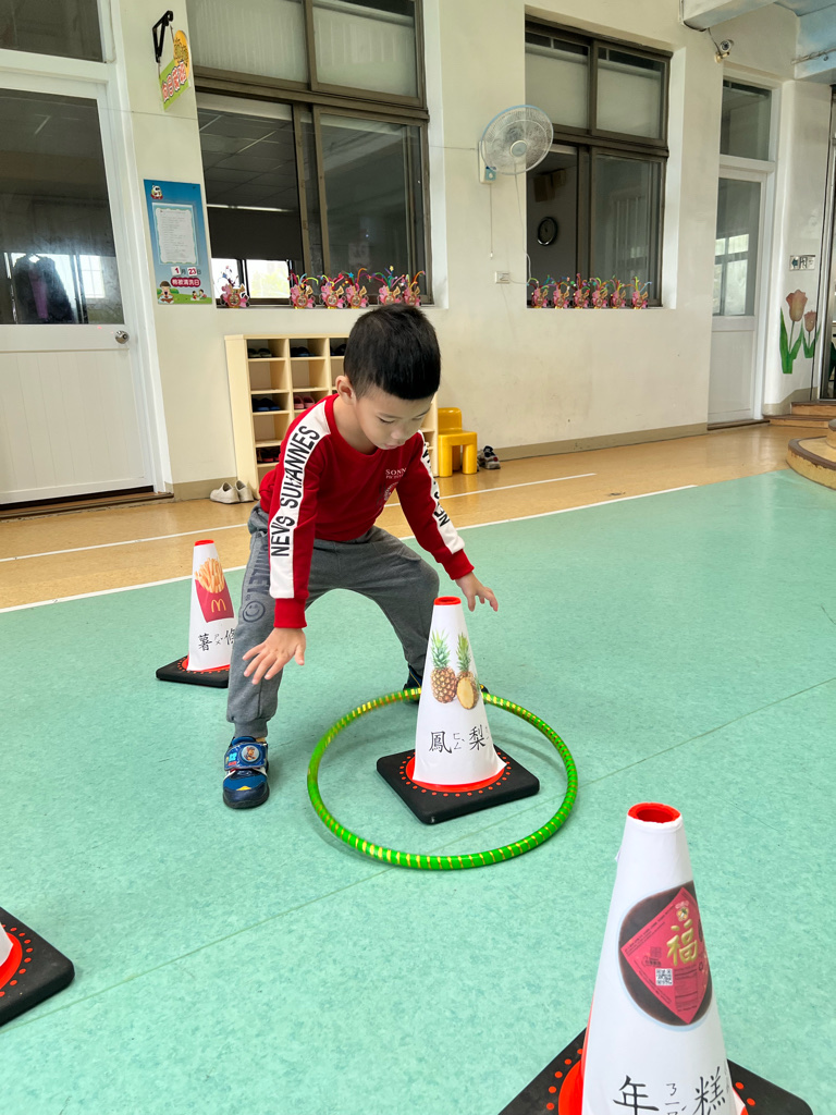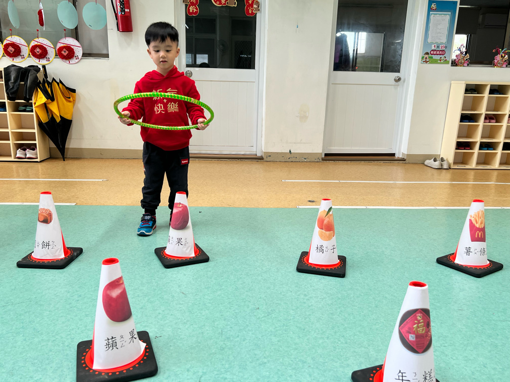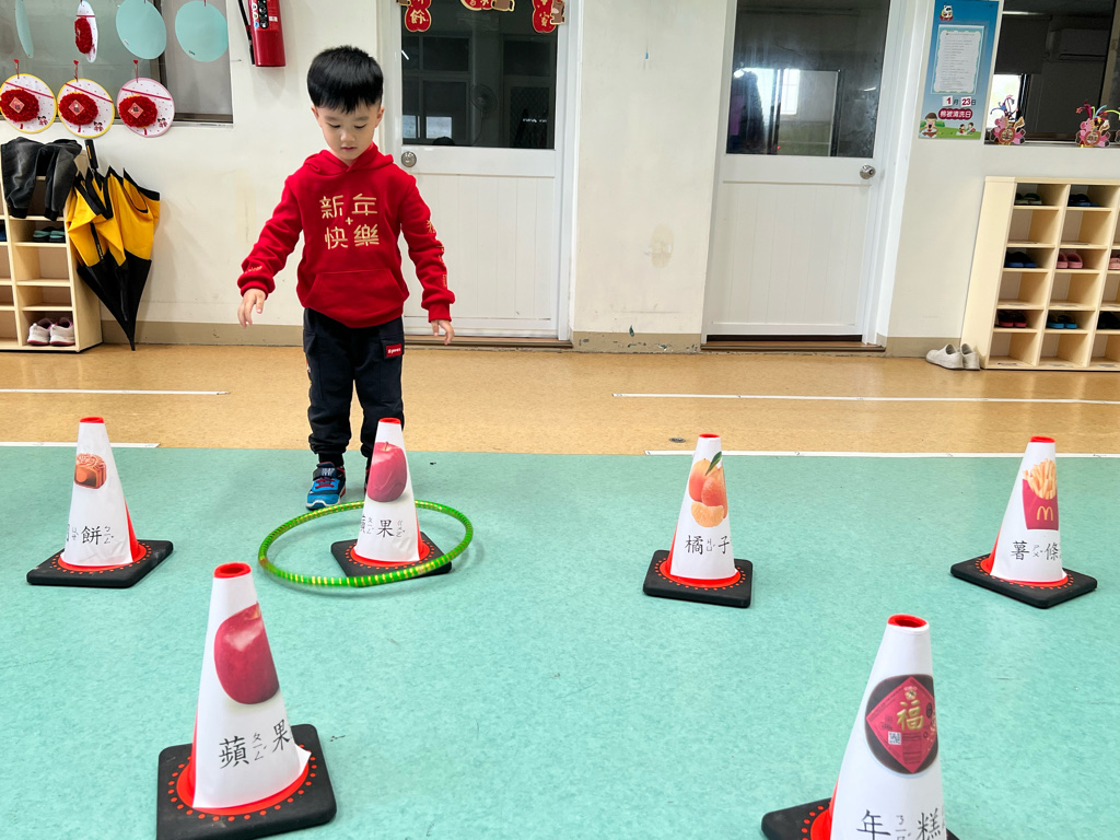 第二關-《關注好運氣》~將呼啦圈丟出並套住貼有吉祥物品寓意的三角錐,即可過關。